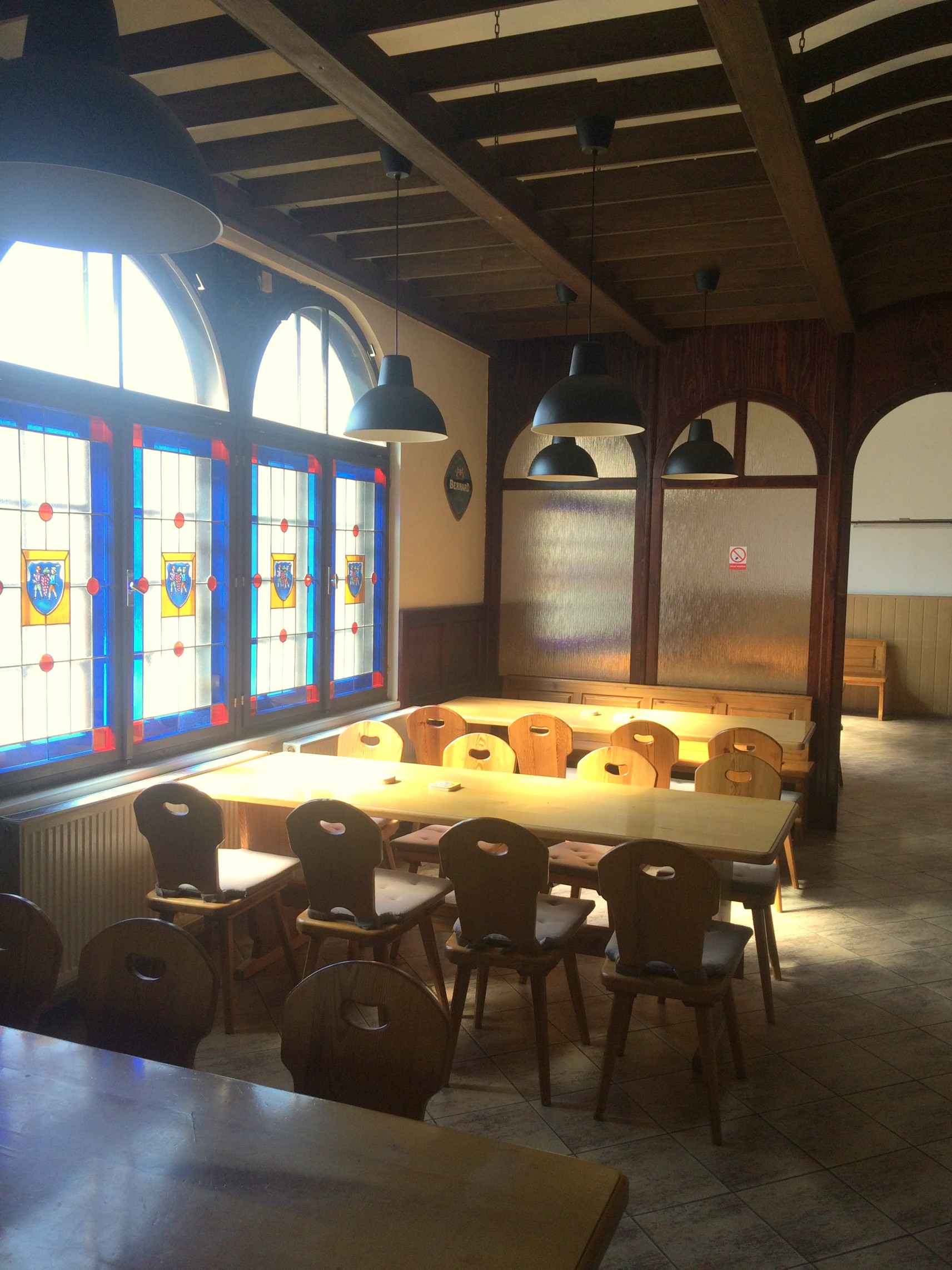 Posezení u masivních dřevěných stolů o celkové kapacitě 35 míst.